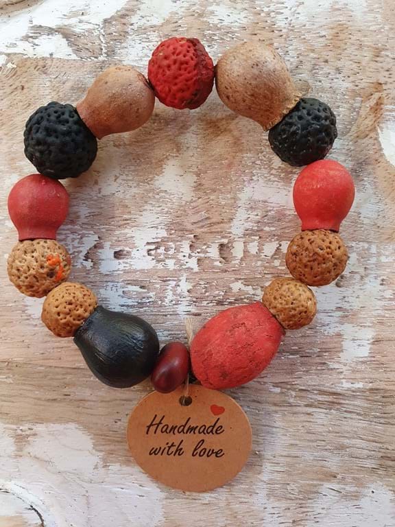 This lovely bracelet is handmade by the Anangu artists and ngangkari women at our Aboriginal Traditional Healing Centre. The 'Bracelet Desert Sand' is made of quandong and eucalyptus seeds.