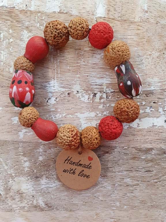 This beautiful bracelet is handmade by the Anangu artists and ngangkari women at our Aboriginal Traditional Healing Centre. The 'Bracelet Red Ochre' is made of quandong and eucalyptus seeds.
