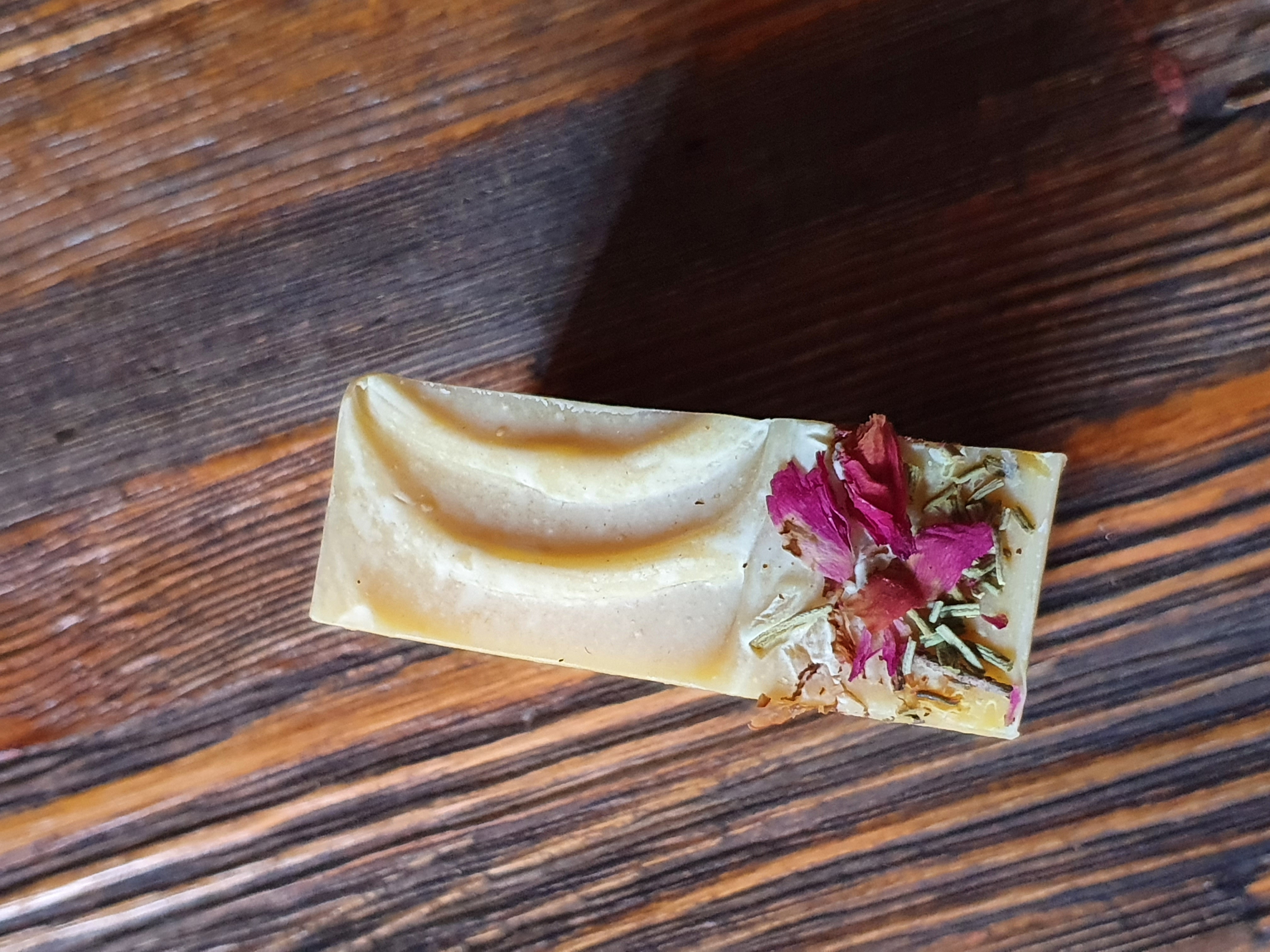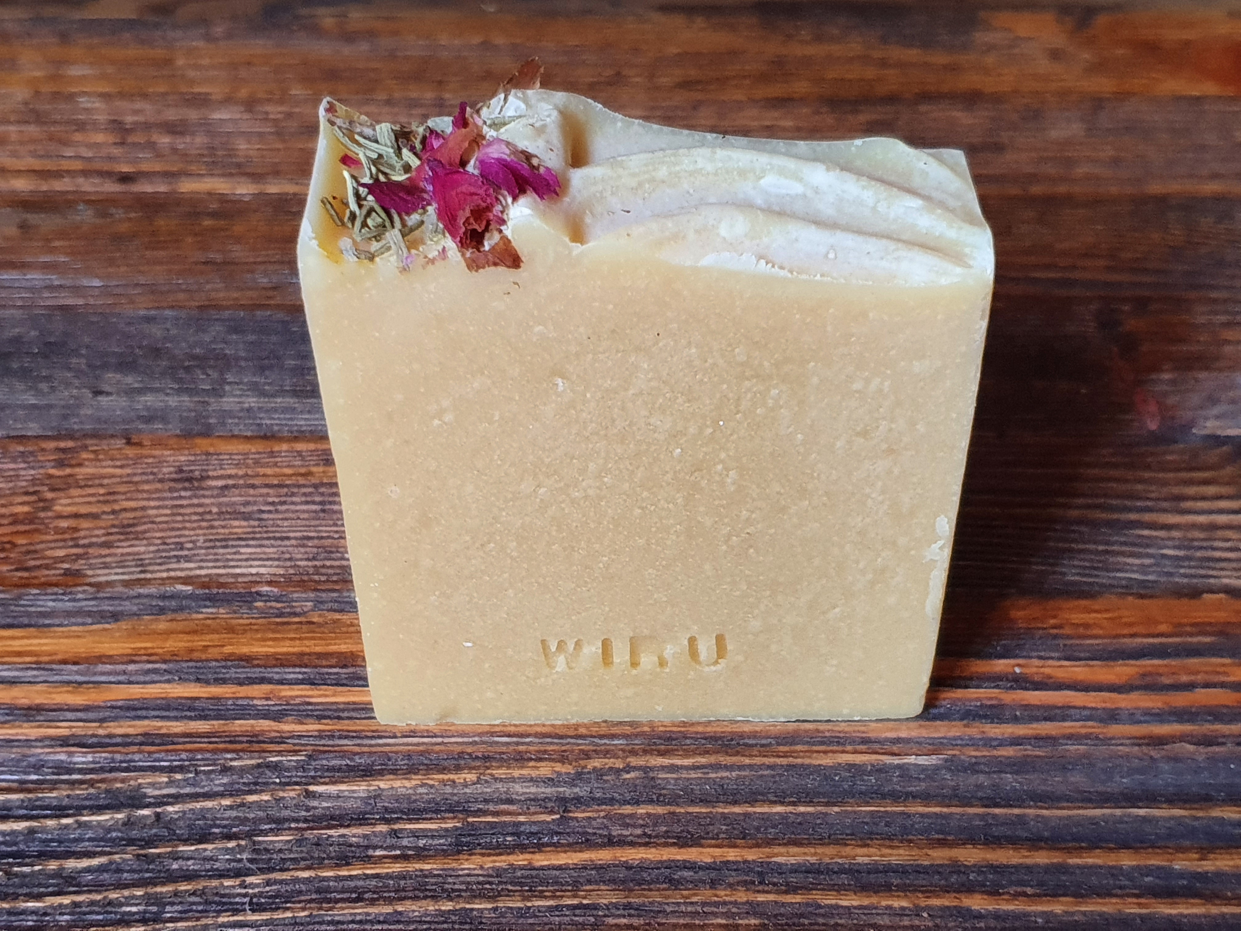 Ingredients: Irmangka-irmangka infused olive oil, Dried rose petals, Rose geranium essential oil, Coconut oil, Rice bran oil, Shea butter, Oat milk, Sodium hydroxide, Sodium lactate, Sodium gluconate.